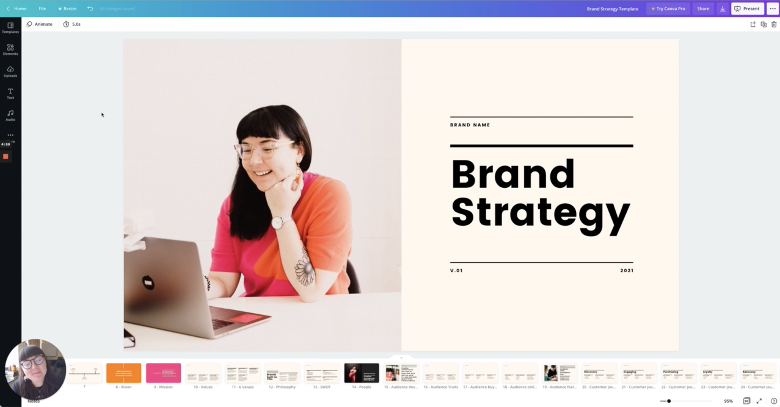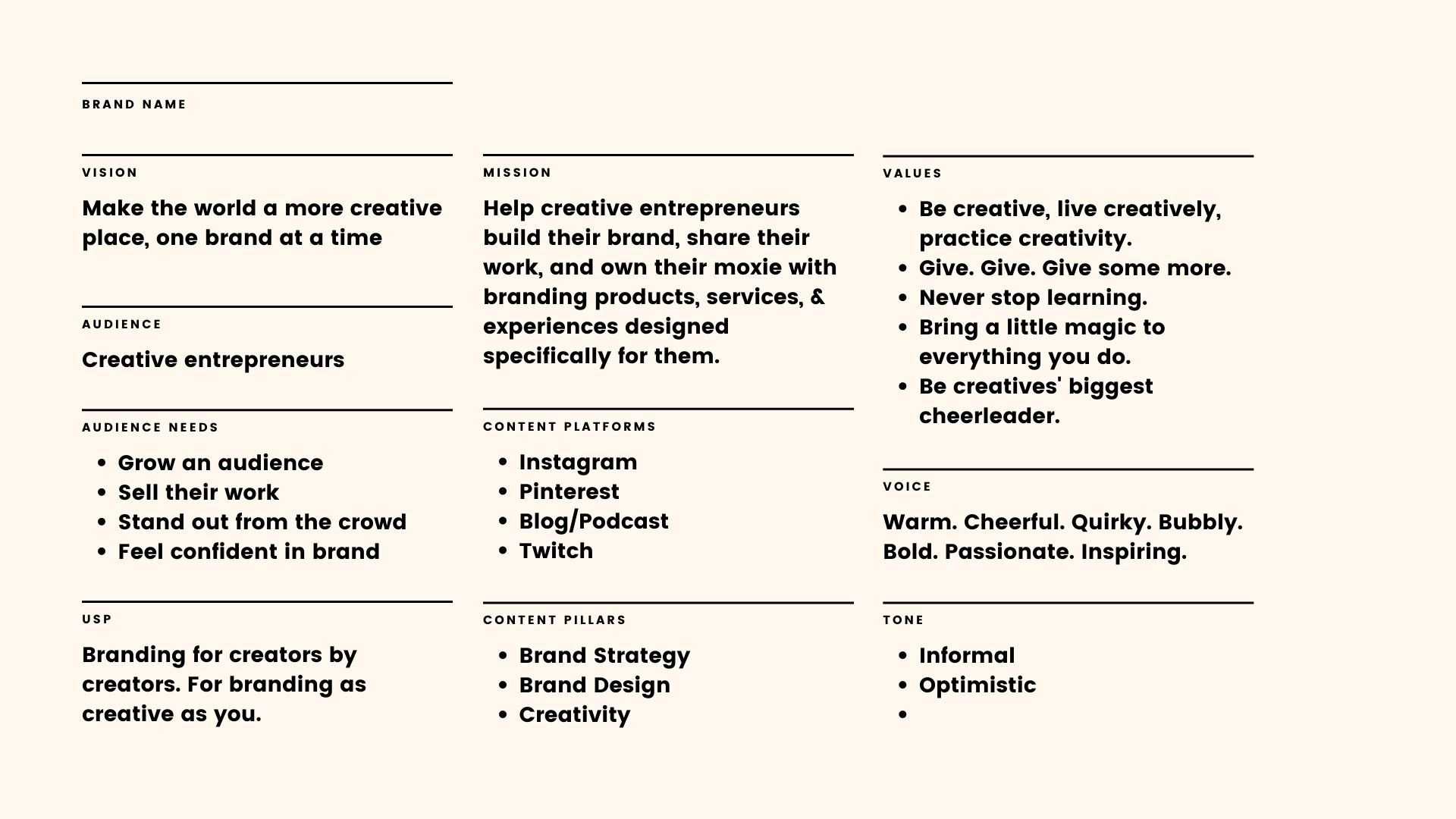 Your easy-to-use, done-for-you, plug-and-play brand strategy template! Just choose the pages you want to use, drop in your content, change the branding, and you're off! You can work through each page almost like a brand strategy checklist, and you'll have a complete, custom strategy!