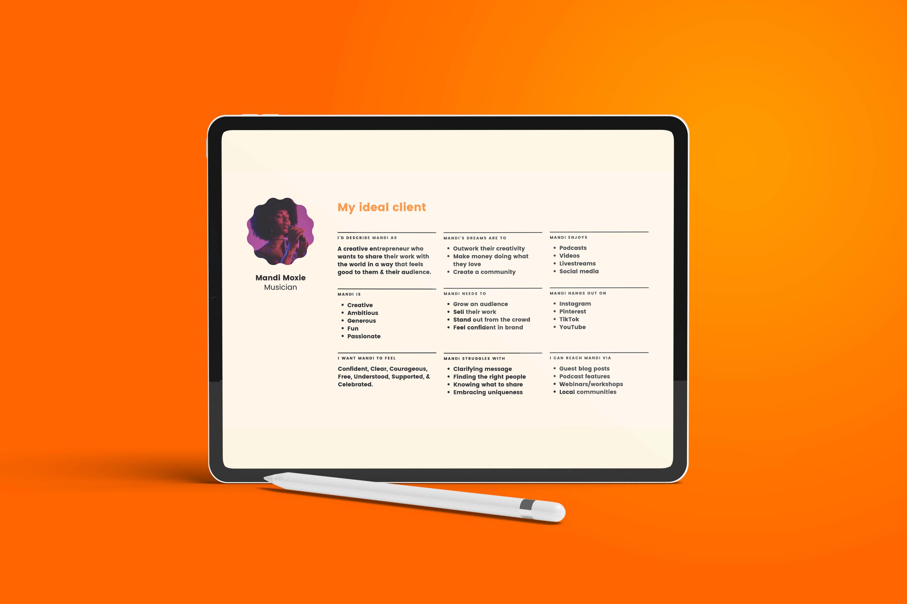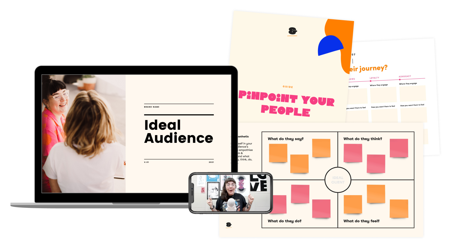 We've also included a bonus, handy, 1-page ideal audience avatar that you can put all of your most important deets in and see at a glance. Pop it on your wall, set it as your desktop, or flick it through to your collaborators!